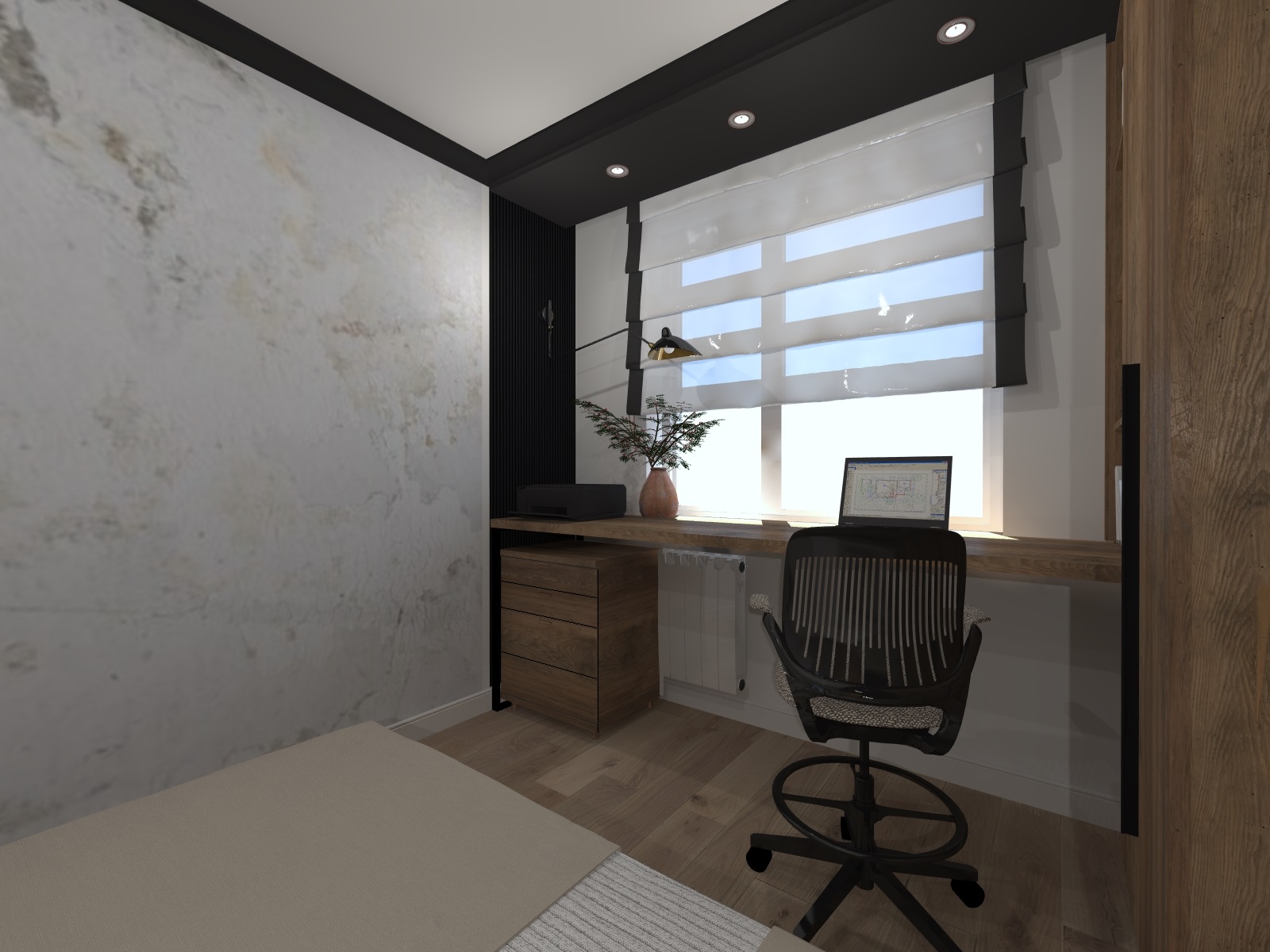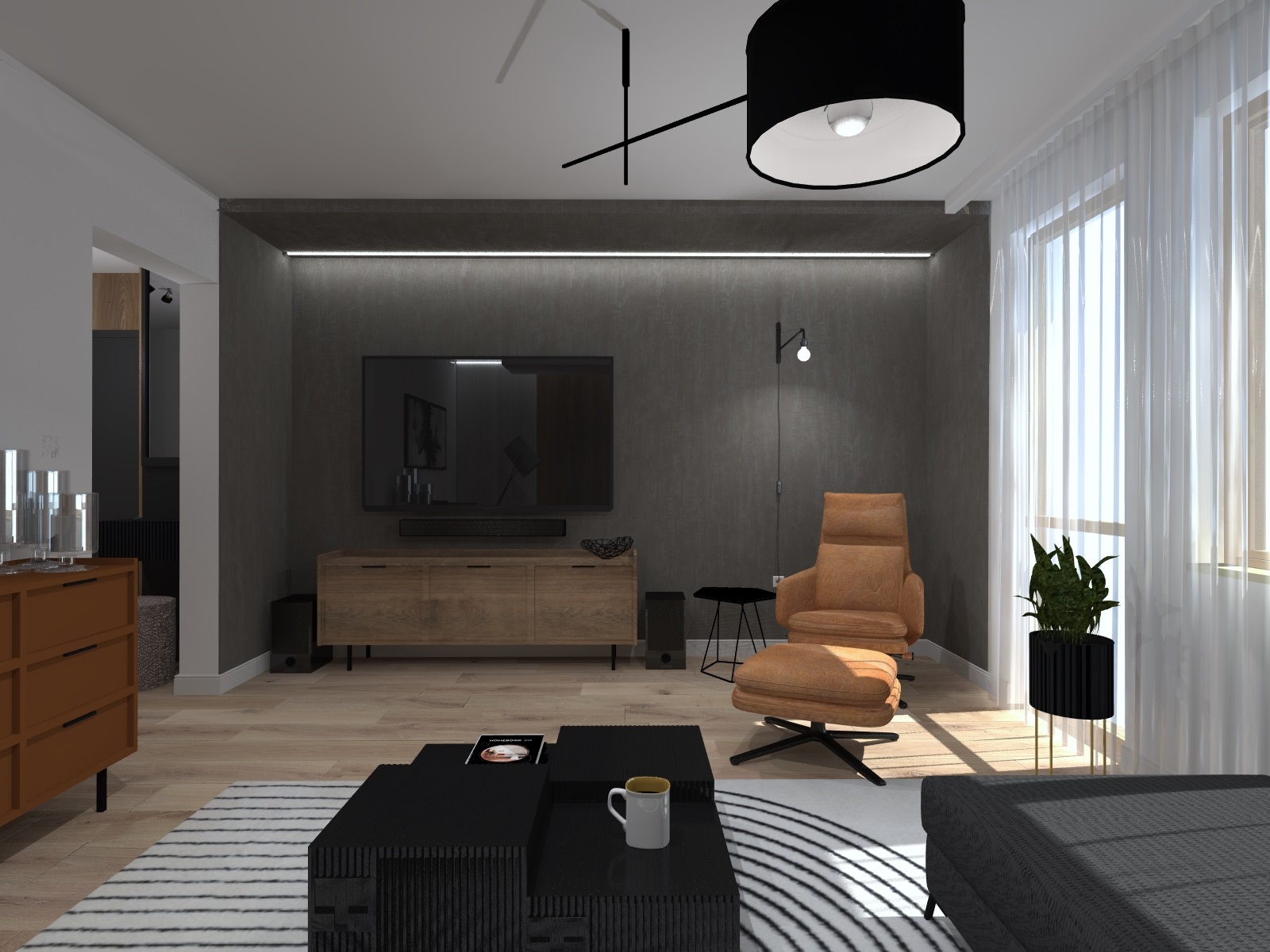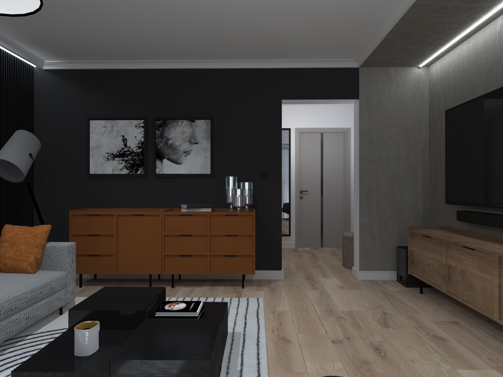 Dzięki ciemnym tonacjom, takim jak czerń i ceglane akcenty, stworzono przestrzeń, która emanuje elegancją i nowoczesnością.