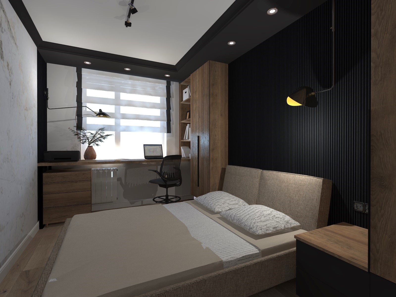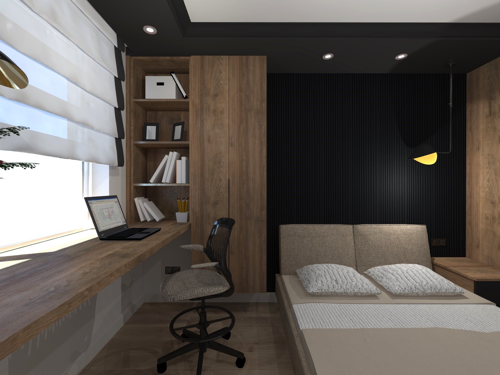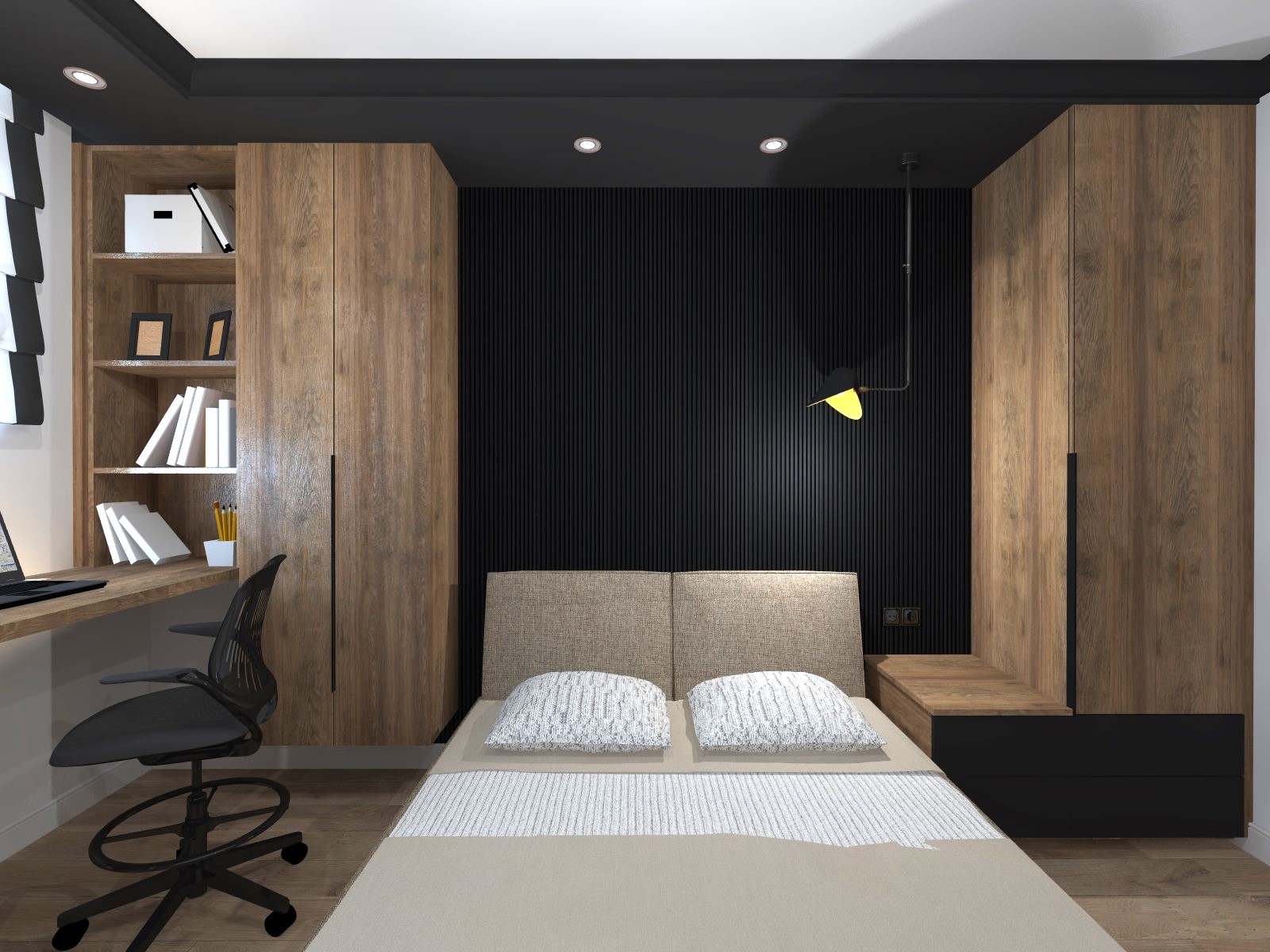 W sypialni króluje ciemne drewno, które idealnie komponuje się z zagłówkiem łóżka pokrytym innowacyjną tapetą 3D.